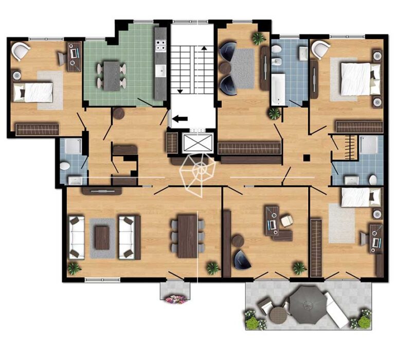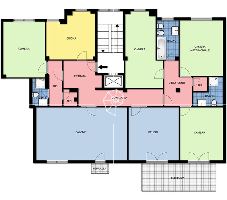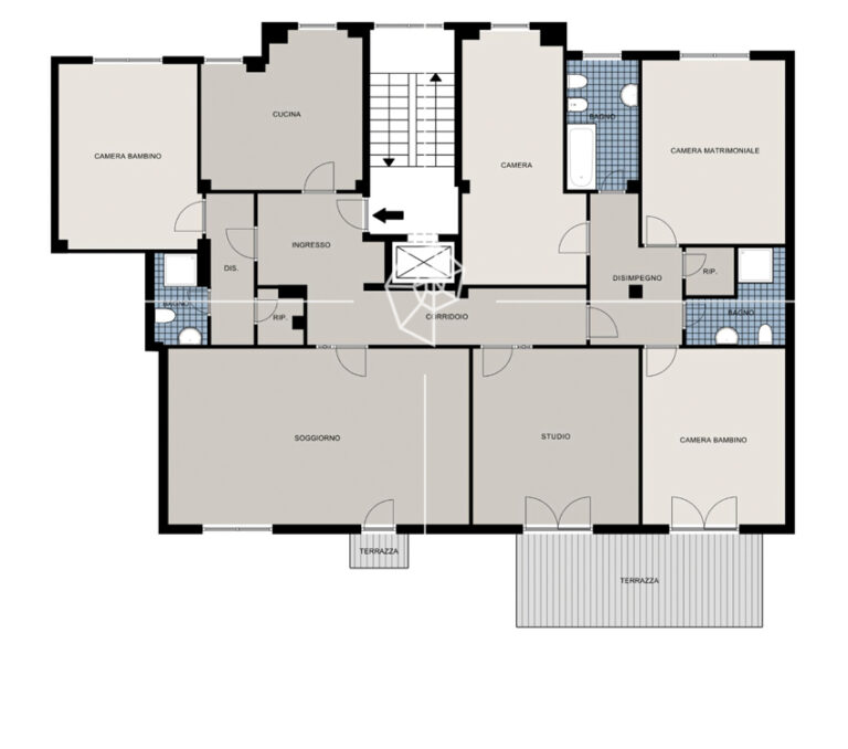 In complesso residenziale di nuova costruzione, 4 LOCALI di mq 156 disposto su due livelli, composto da ampio salone con accesso al balcone, cucina abitabile, due camere da letto con accesso al balcone, doppio servizio e spazioso locale open – space con servizio al piano superiore con accesso all’ampio terrazzo.